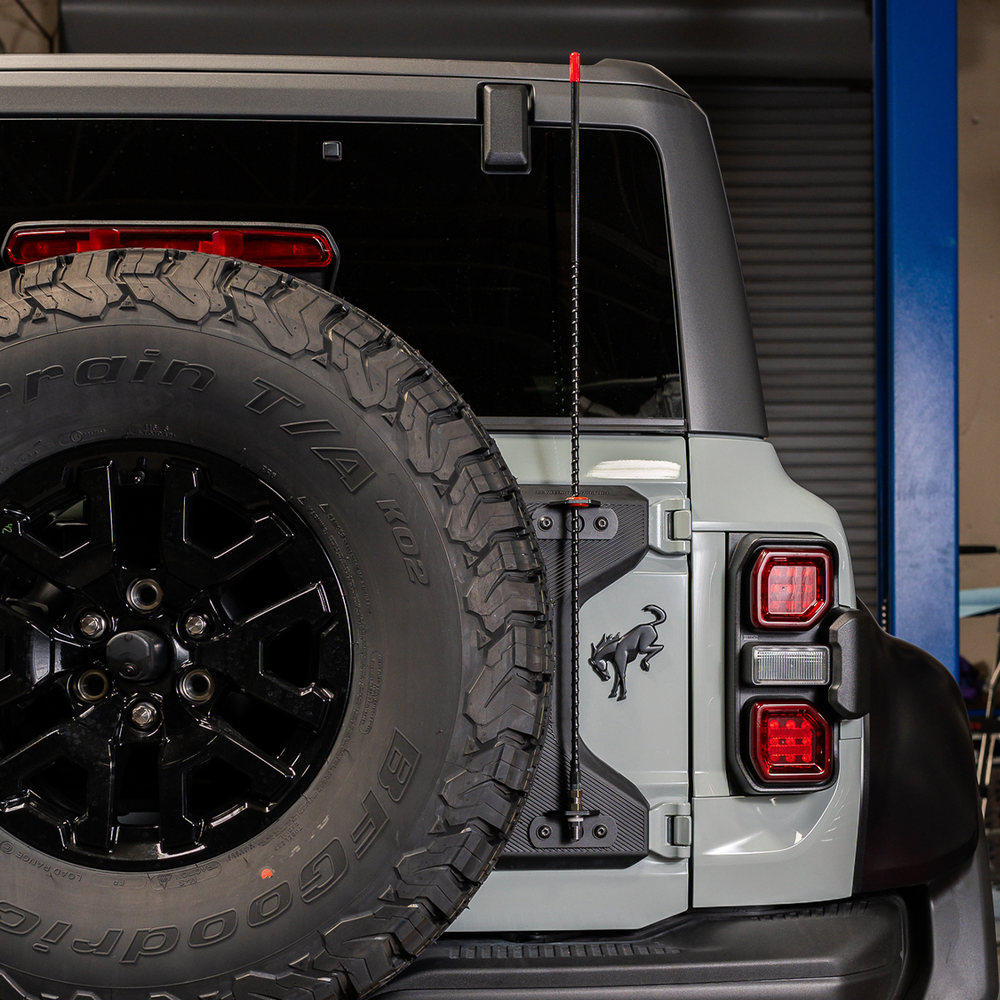 The Bronco Rear Antenna Mount by Cali Raised LED is designed for the 2022+ Ford Bronco Raptor. Crafted with precision from durable .1875 HRPO steel, this mount is engineered to secure your antenna with a rubber grommet, ensuring optimal signal reception by keeping it in place and guaranteeing uninterrupted communication during your off-road adventures.