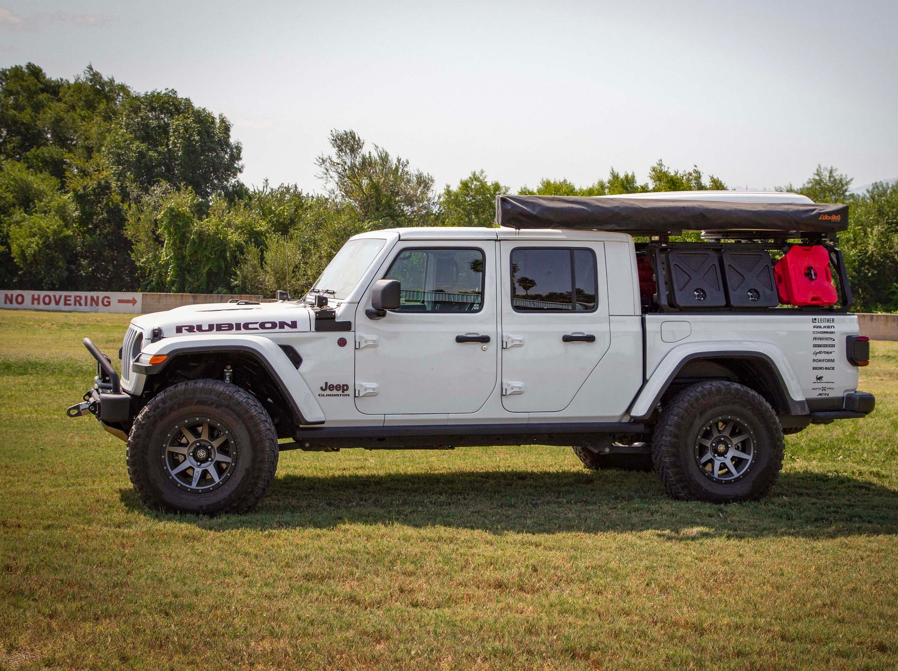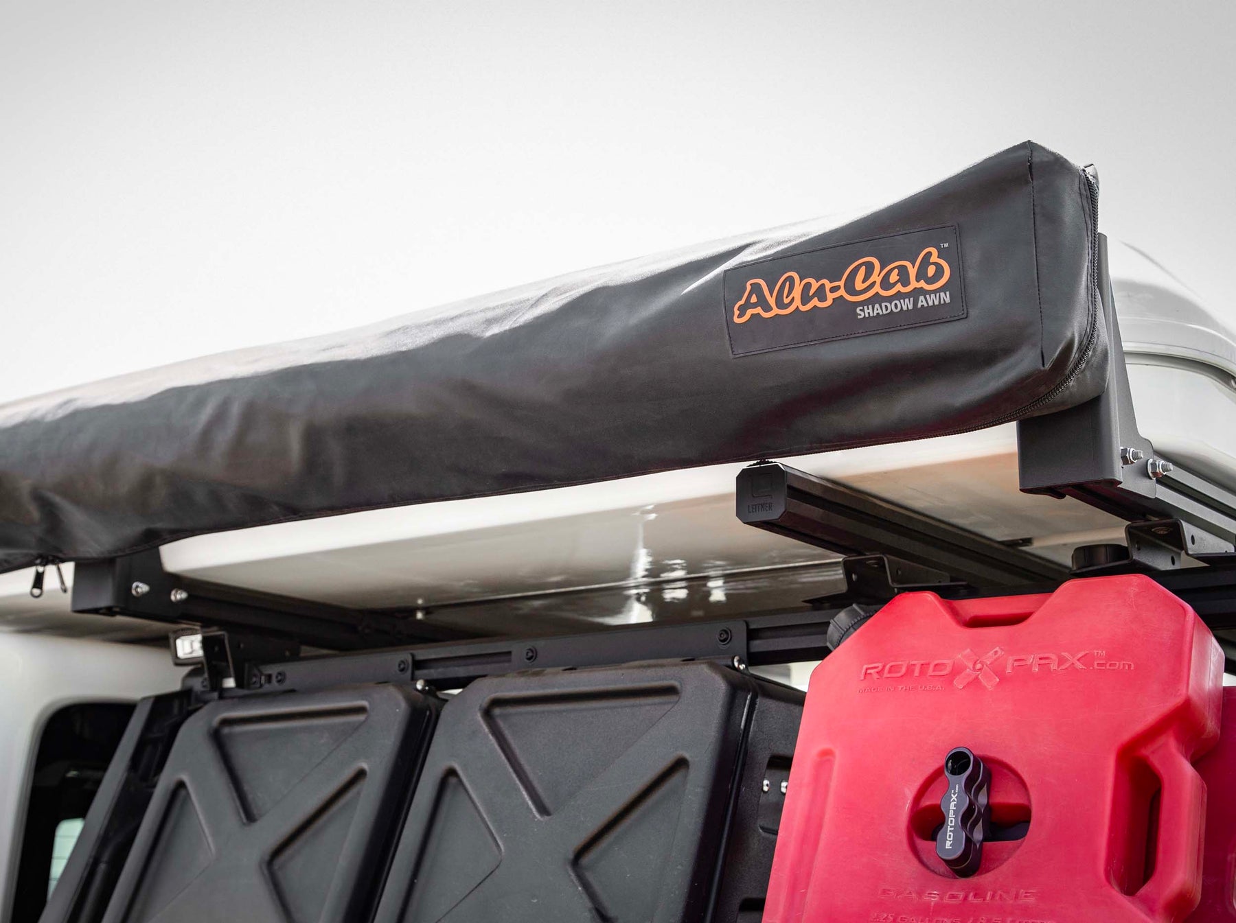 The HD Awning Bracket was designed for the heaviest and largest awnings, and specifically engineered for the Alu-Cab Shadow Awning. This is a MUST HAVE product if you are planning to mount an awning longer than 60” on a Jeep Gladiator as it allows the awning to go over the roof. The HD Awning Bracket attaches directly to the load bars which DOES NOT ALLOW the rear load bar to slide.